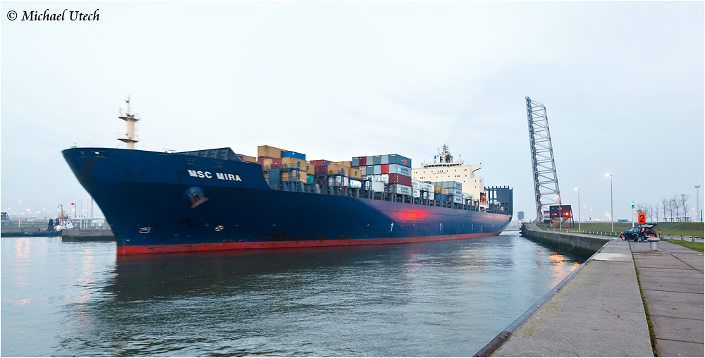 Ein mittelgroßes Containerschiff verlässt eine der Doppelschleusen im Hafen.