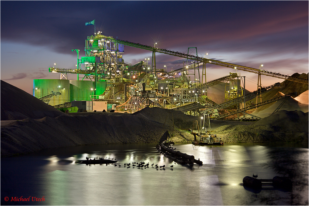 Zur Beleuchtung passend gab es noch einen bunten Sonnenuntergang genau hinter dem Werk. Die Belichtung gestaltet sich hier aufgrund der vielen Details recht schwierig, in diesem Falle habe ich HDR-Technik für den Himmel und zusätzlich noch DRI per Ebenen für die Lichter verwendet.