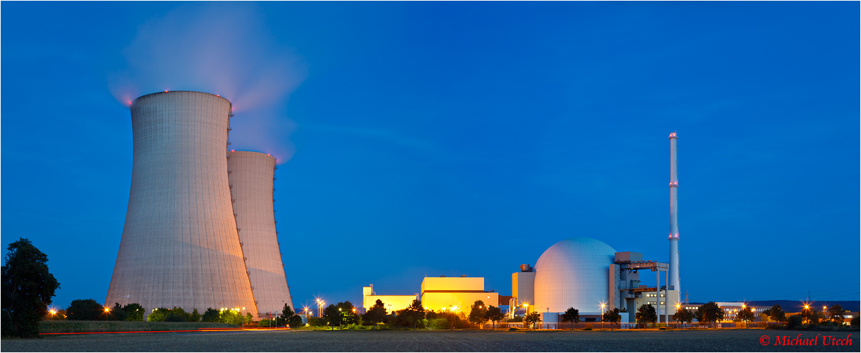 Panoramaansicht des Kernkraftwerk Grohnde von Nordwesten zu Beginn der blauen Stunde.