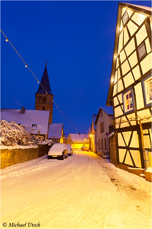 Schneebdeckte Straße und die Lachener Dorfkirche.