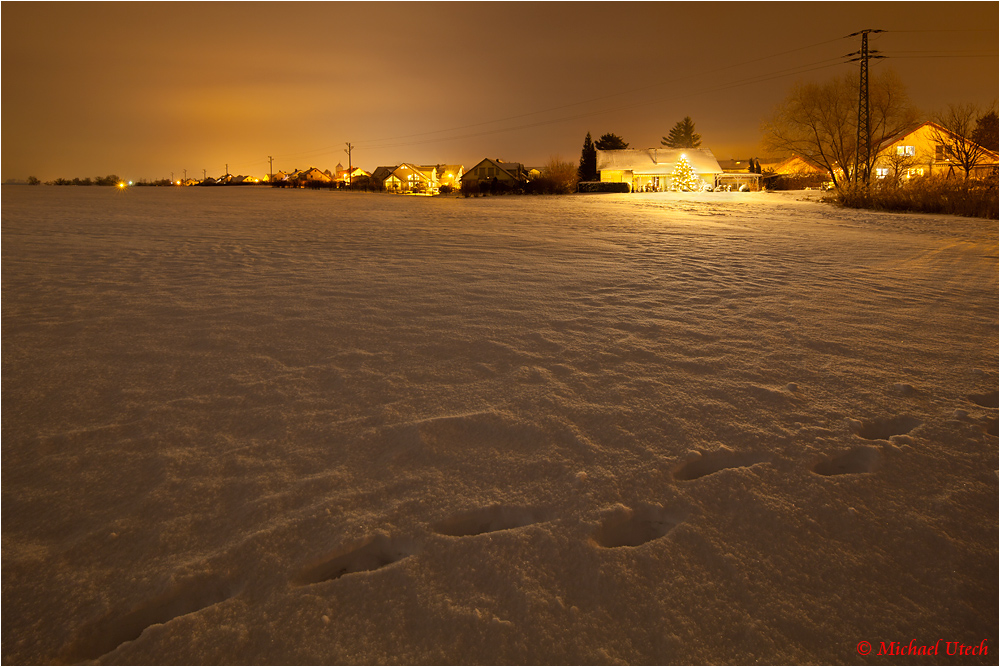 Fußabdrücke im Schnee mit dem Dorf als Hintergrund.