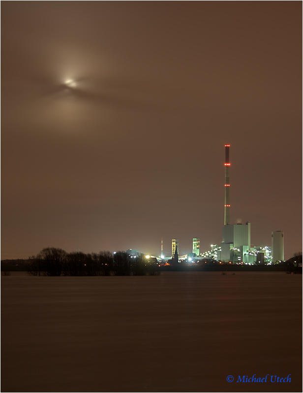 Kraftwerk und Zeche Walsum mit reichlich Hochwasser und wolkenverhangenem Mond.