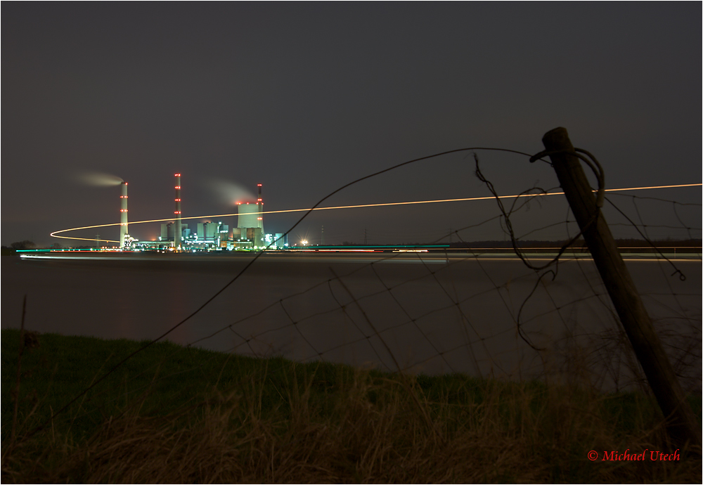 Reichlich Verkehr auf dem Rhein, dahinter Kraftwerk Voerde.