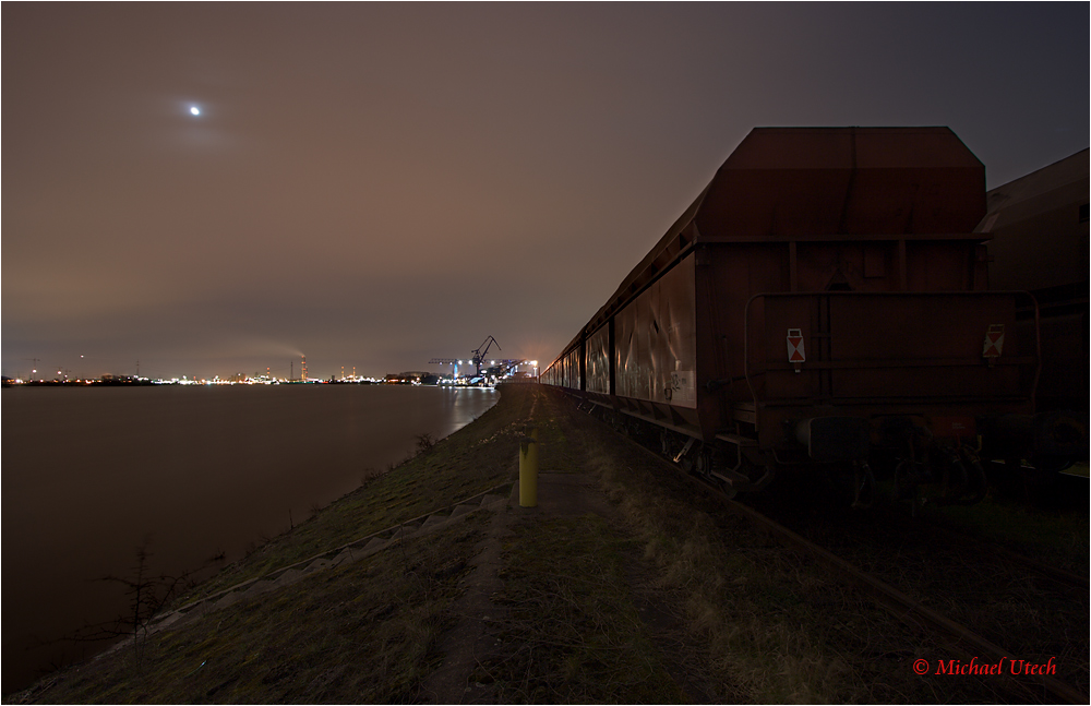 Unheimlich langer Zug ;-) Sicht zum Hafen, diesmal aber im Ultraweitwinkel.