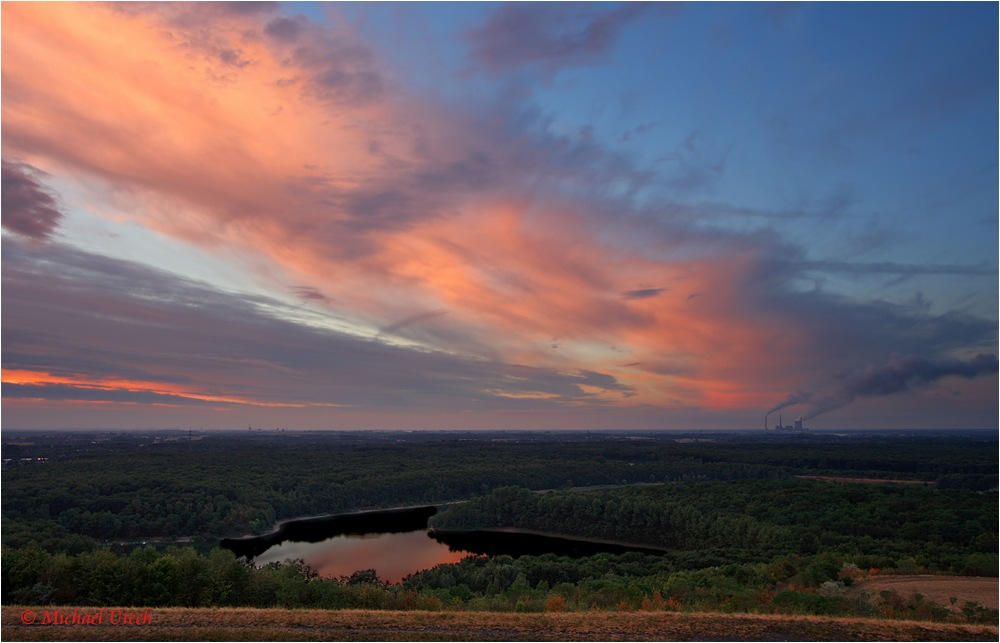Blick nach Norden von der Halde Rheinpreußen, rechts am Horizont das Kraftwerk Voerde.