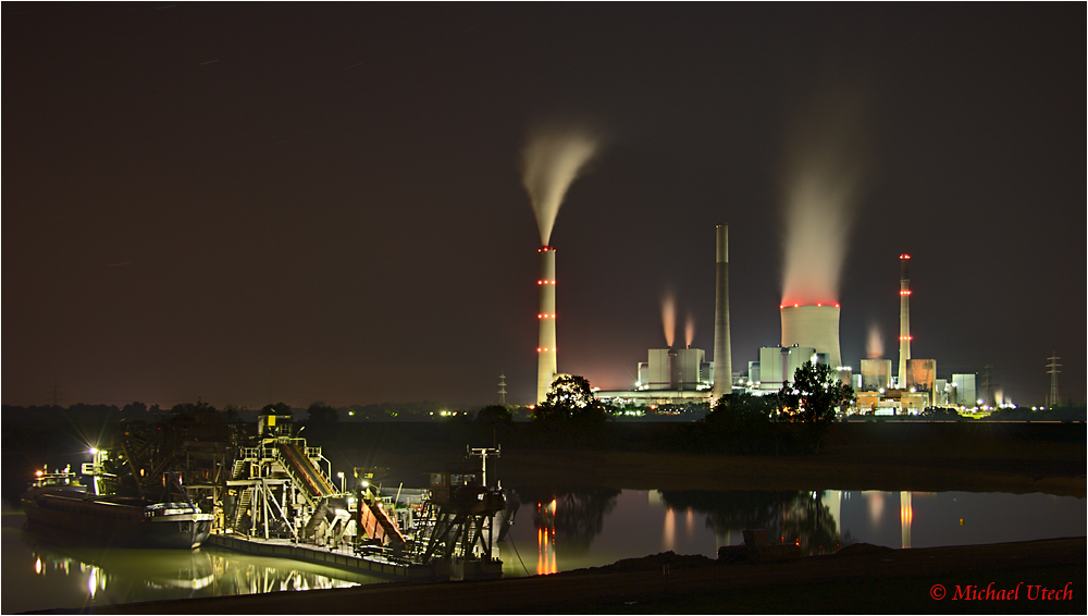 Die Sicht auf das Kraftwerk vom Deich aus, davor noch ein weiteres Auskiesungsbecken.
