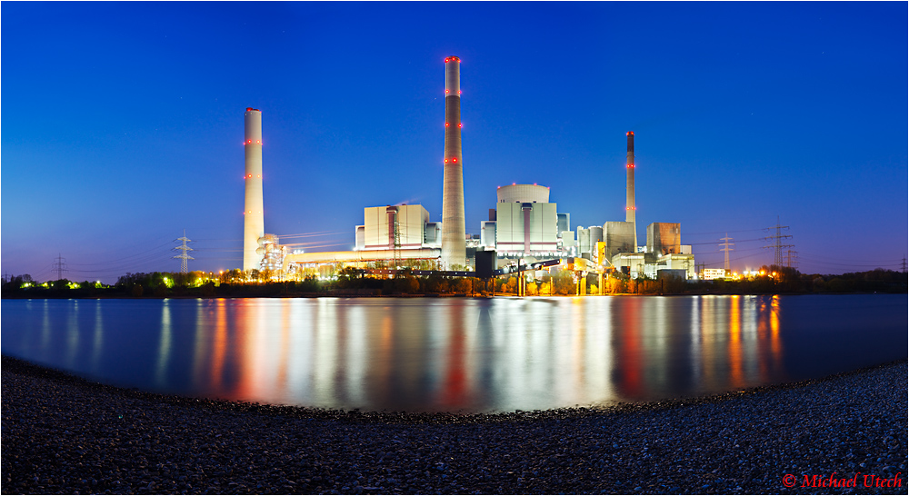 Fast perfekte blaue Stunde, das Kraftwerk Voerde im Panoramaformat mit etwas Ufer vorne.
