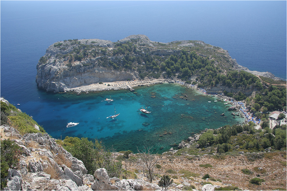 Blick von oben auf die Anthony-Quinn-Bucht.
