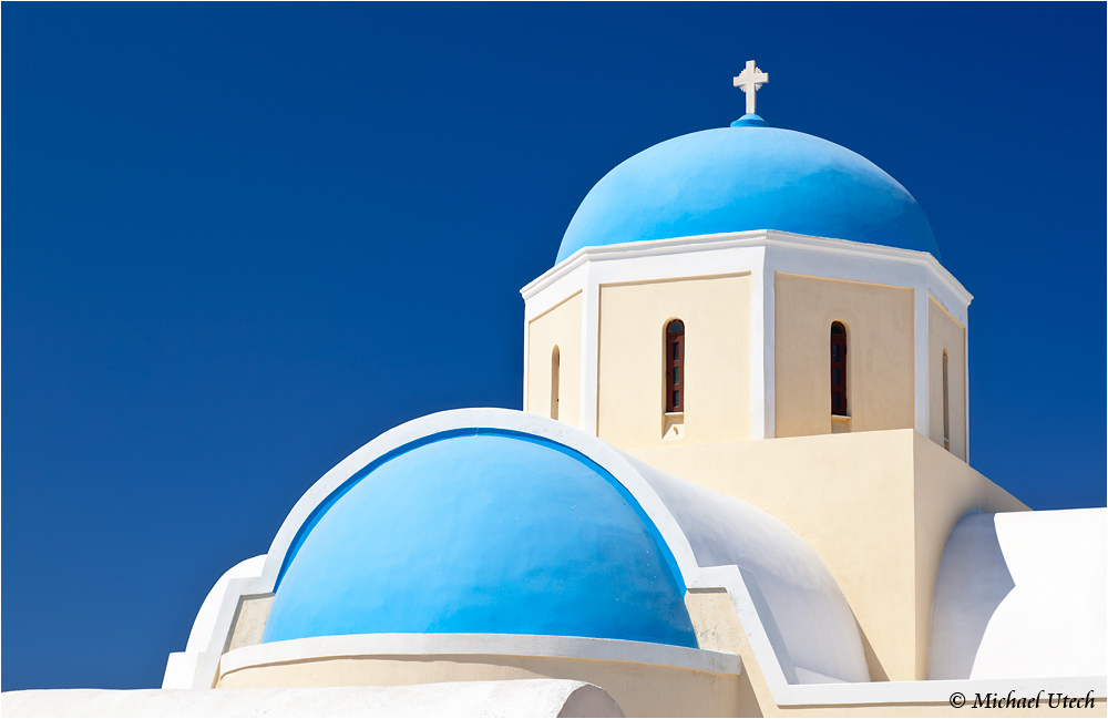 Eine farbenprächtige Kirche am Ortseingang von Oía.