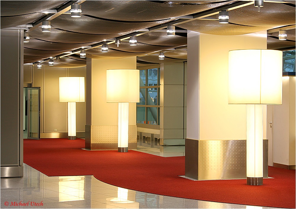Roter Teppich und interessante Lampen, kein Mensch würde hier an einen Flughafen denken.