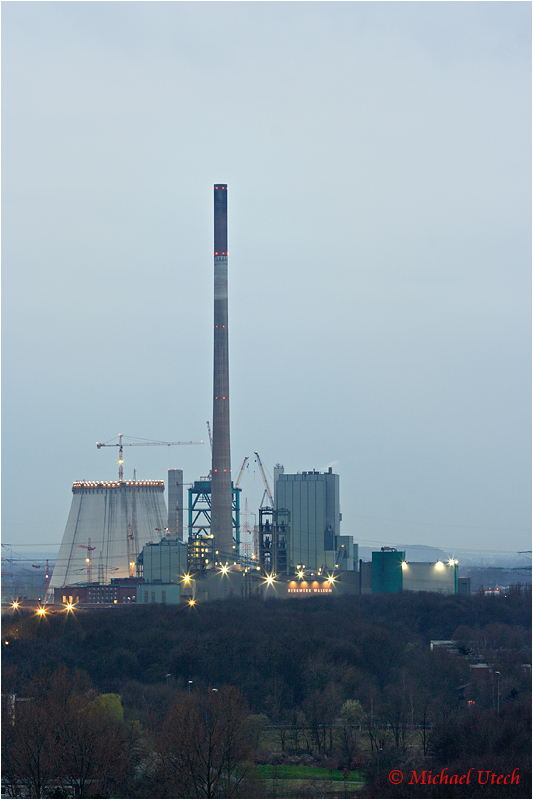 Bergwerk und Kraftwerke in Walsum kurz nach Sonnenuntergang.