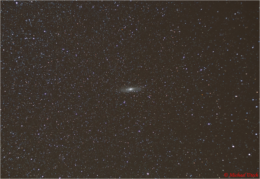 Die Andromeda Galaxie (M31) bei 50mm, sie ist eines der wenigen Objekte, das man erstens mit bloßem Auge sehen kann und zweitens auch ohne Nachführung aufs Bild bekommt.