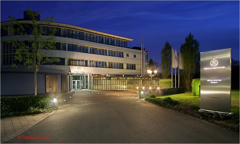 Eingangsbereich der Erdgas Münster zur Blauen Stunde.