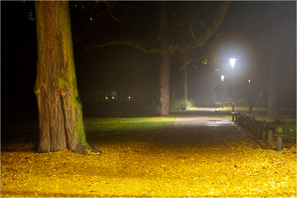 Die gelben Blätterreste vom Herbst mit leichtem Nebel.
