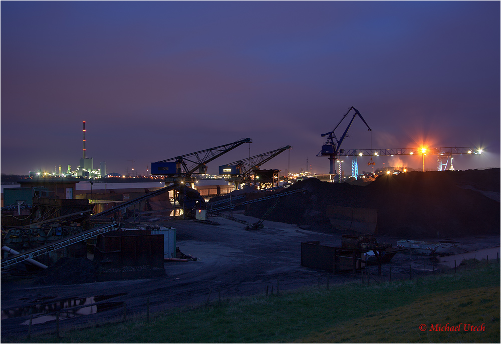 Sicht auf den Hafen vom Deich aus, dahinter Kraftwerk Walsum. Die Scheinwerfer am Schienenkran sind allerdings ziemlich stark.