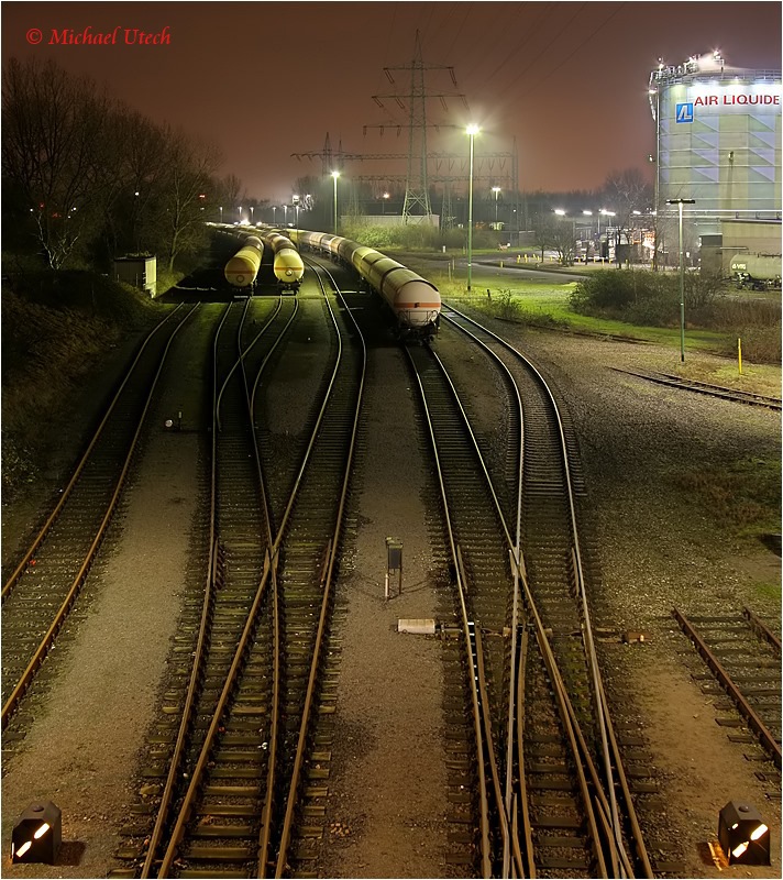 Brücke über die Werksgleise, rechts der von der A3 aus zu sehende Behälter.