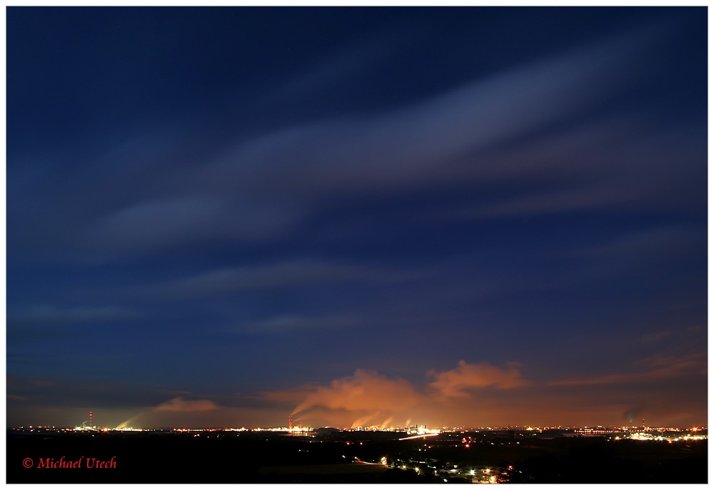 Blauer Himmel über dem hell leuchtenden Ruhrgebiet.