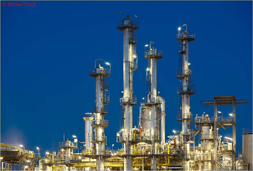 Silber und Blau ist die ansehnliche Farbkombination der Destillationstürme zur blauen Stunde.