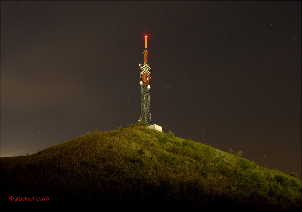 Die Spitze der Halde mit dem Sendeturm und Sternspuren.