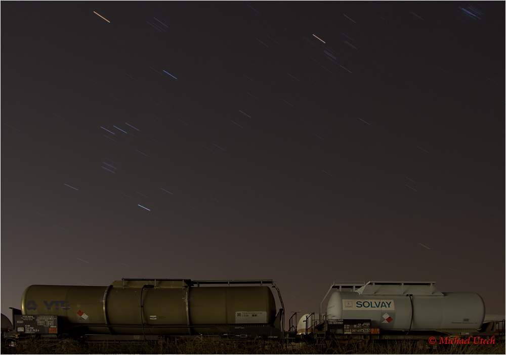 Waggons mit Sternspuren auf einem Abstellgleis.