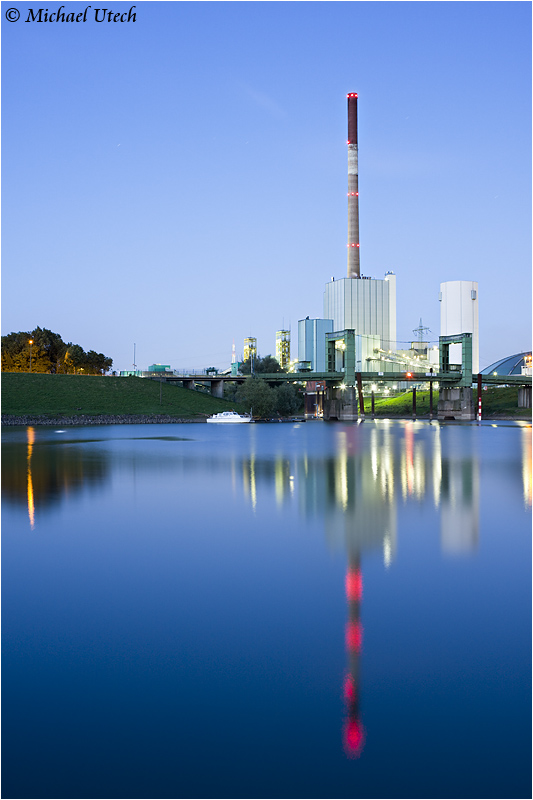 Kraftwerk und Zeche Walsum mit der Hafeneinfahrt und Brücke.