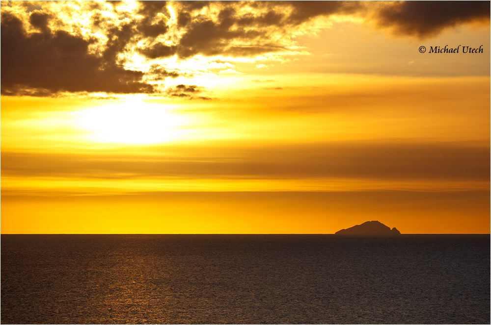 Farbenfroher Sonnenuntergang bei Redonda durch die Vulkanasche von Montserrat.