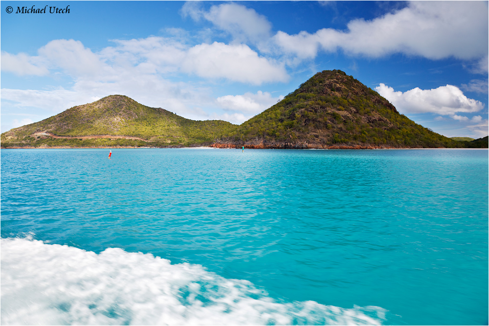 Blick vom Boot auf die grünen Hügel Antiguas.