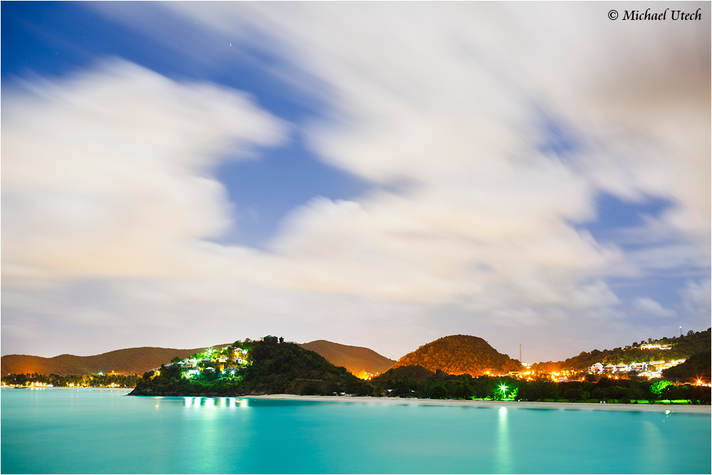Nachtblick über die Valley Church Bay zum Cocos Hotel.