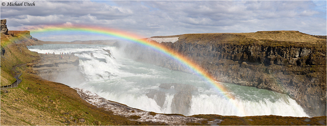 Der riesige Gullfoss empfing uns im Sonnenlicht mit einem fantastischen Regenbogen.