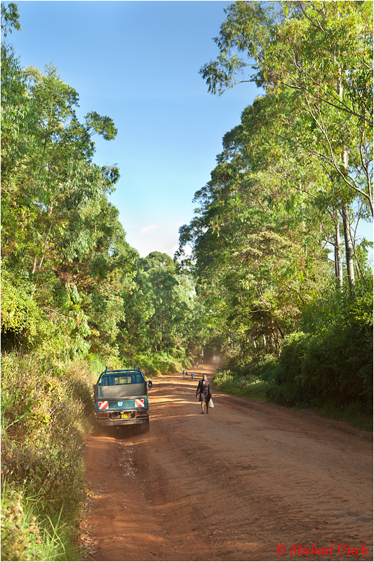 Eine der alten, unasphaltierten Hauptstraßen. Die Fahrzeuge rumpeln meist kaum schneller als ein Fahrrad durch die ganzen Löcher.