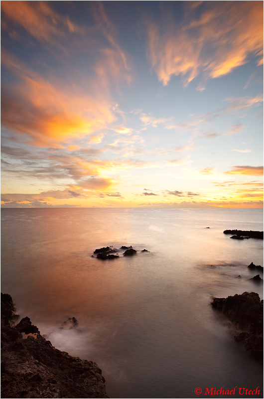 Die zackigen Felsen stehen im Kontrast zum verwischten Wasser und den warmen Farben.