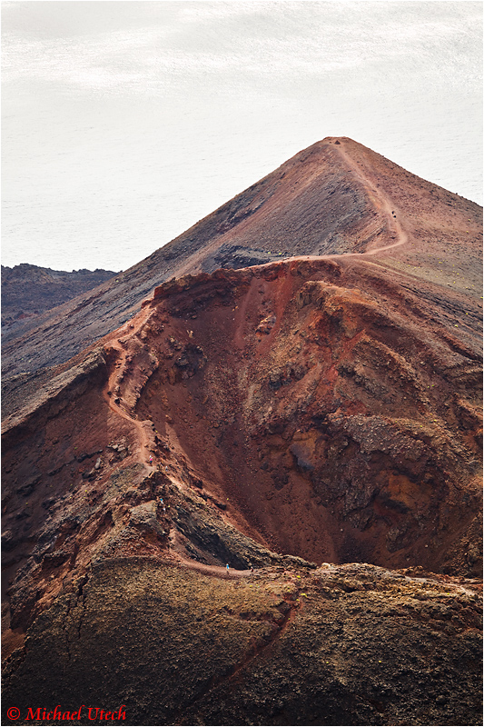 Blick zum tiefergelegenen Vulkan Teneguía mit seinem roten Gestein.