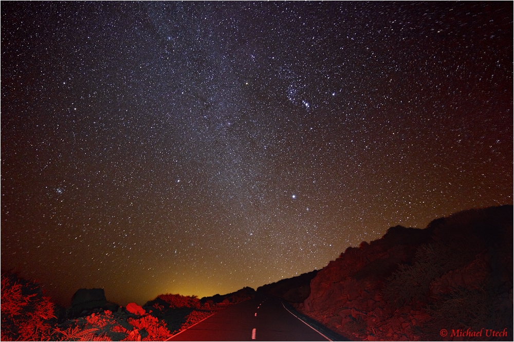 Die Straße Richtung Osten mit dem Schein des Standrücklichts.