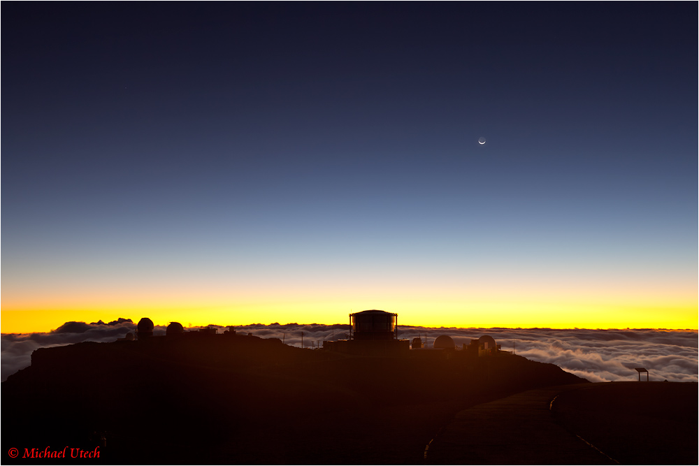 Eine leichte Mondsichel über den Observatorien.