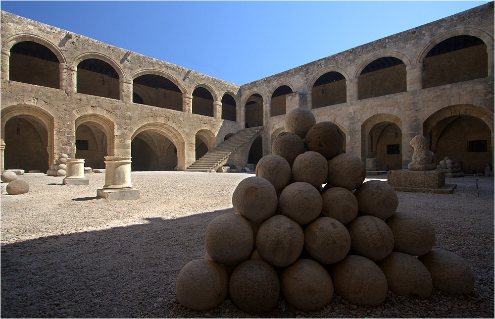 Ein Haufen Kanonenkugeln in einem Gebäude in Rhodos-Stadt.