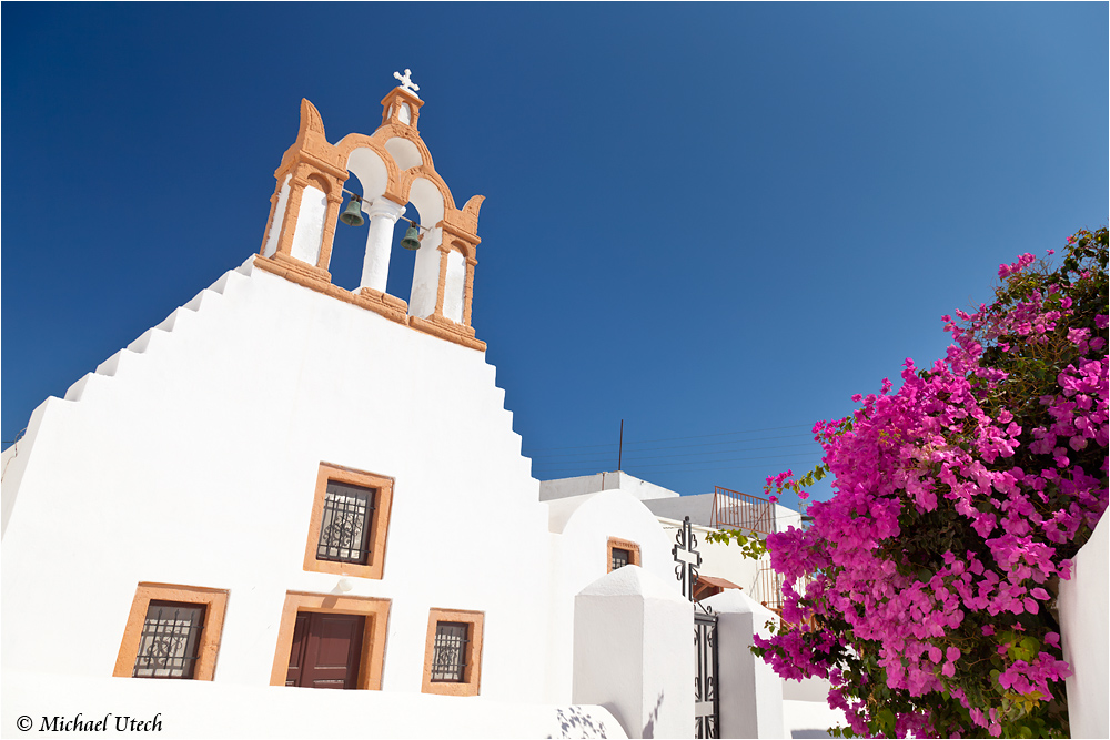 Kirche und Bougainvillea in Emborio.