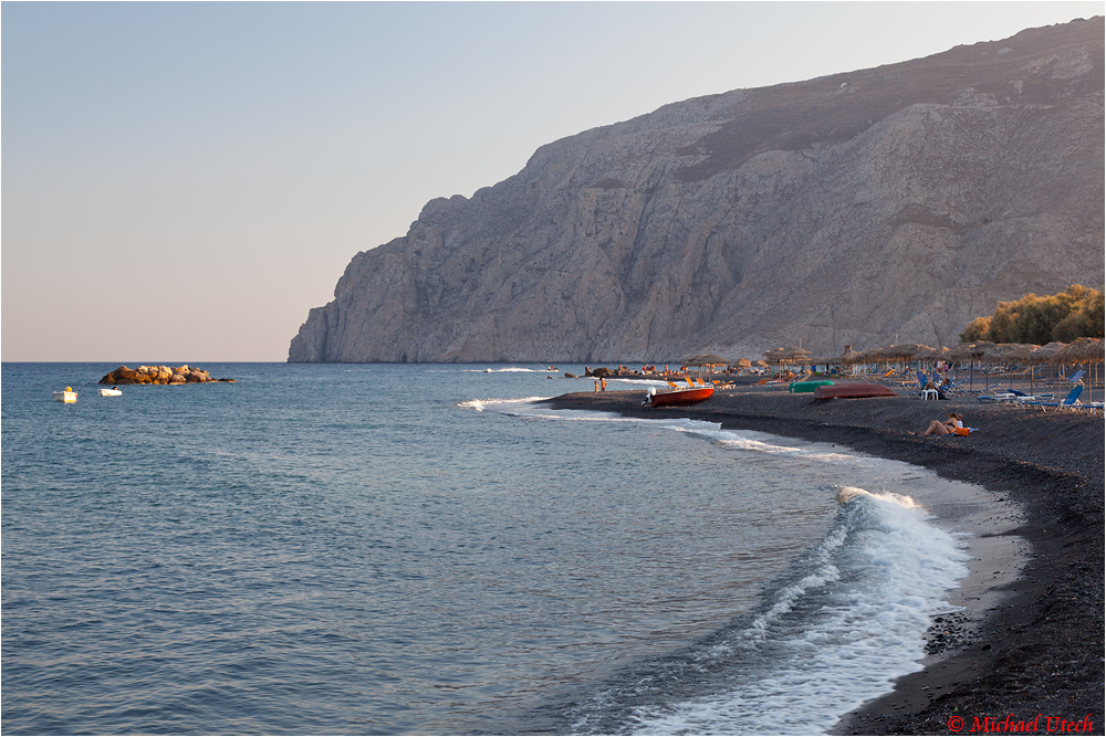 Abendstimmung am letzten Tag am Kamari Beach, unserem nächsten Strand vom Hotel aus.