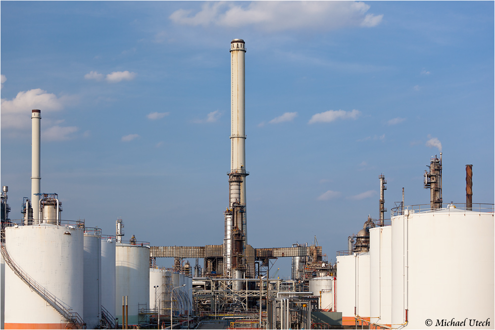 Ein Kamin gerahmt von Öltanks.