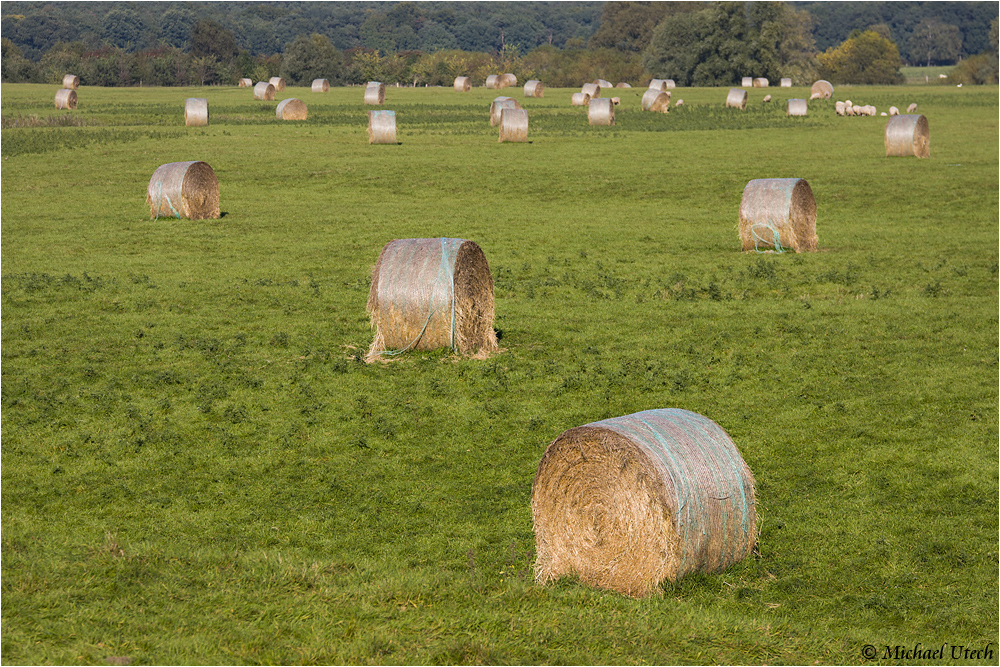 Wie ausgeschüttet liegen die Ballen auf dem Feld.