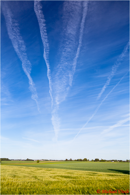 Zahlreiche Kondensstreifen von Flugzeugen verzieren den Himmel.