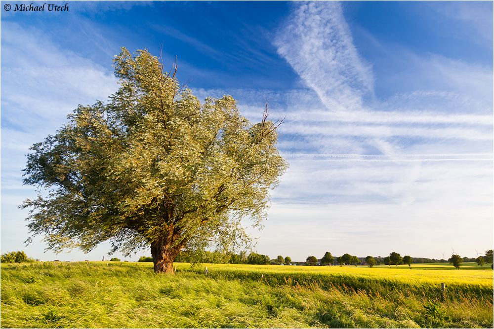 Ein schöner alleinstehender Baum zwischen Feldern.