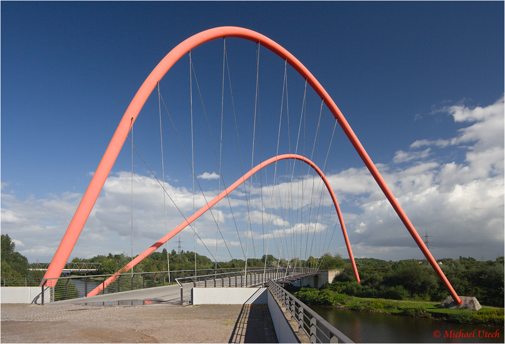 Die Doppelbogenbrücke über den Rhein-Herne-Kanal ist wohl die bekannteste Ansicht aus dem Park.
